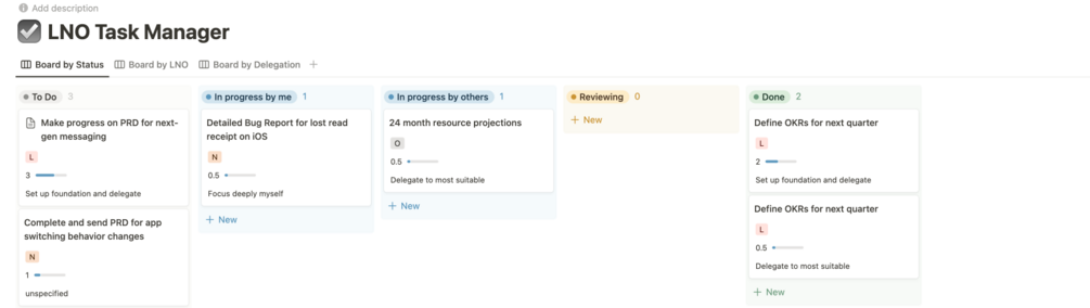 This template helps you work with Shreyas Doshi's LNO & Radical Delegation Frameworks.